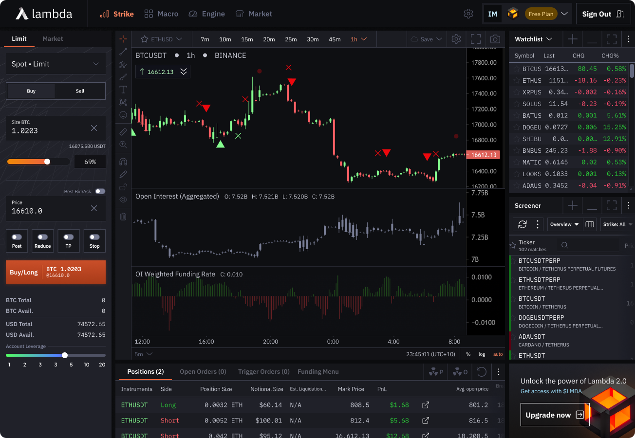 Get unlimited timeframes + basic orderflow tooling — privileges usually reserved as paid features on other platforms. All users (including free access) can trade via their preferred exchange, while charting on Lambda 2.0 — there is no need to navigate to other platforms to chart or get data to help inform your trades. &#x20;