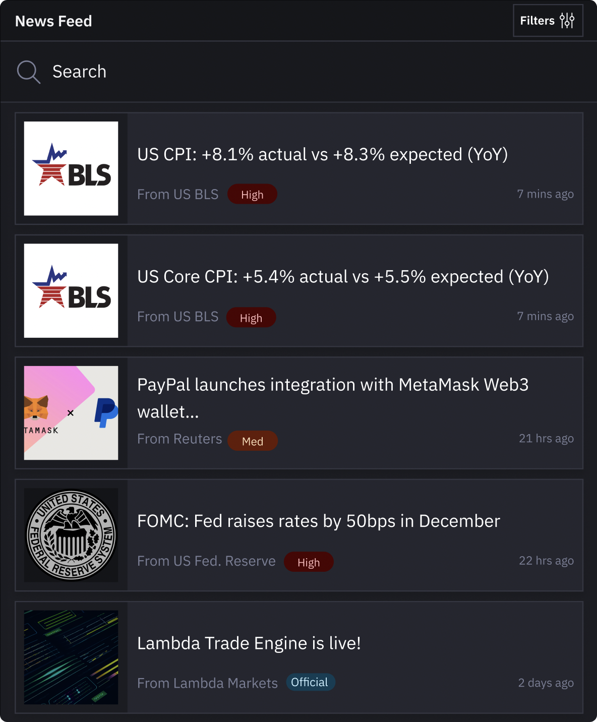 Reserved for ‘Basic’ and ‘Pro’ subscribers is the Lambda 2.0 Newsfeed. The news headlines that move markets will be captured here for users to act on in real-time — **trade news and unscheduled events** in the Lambda 2.0 web application based on accurate and timely news prints.&#x20;
